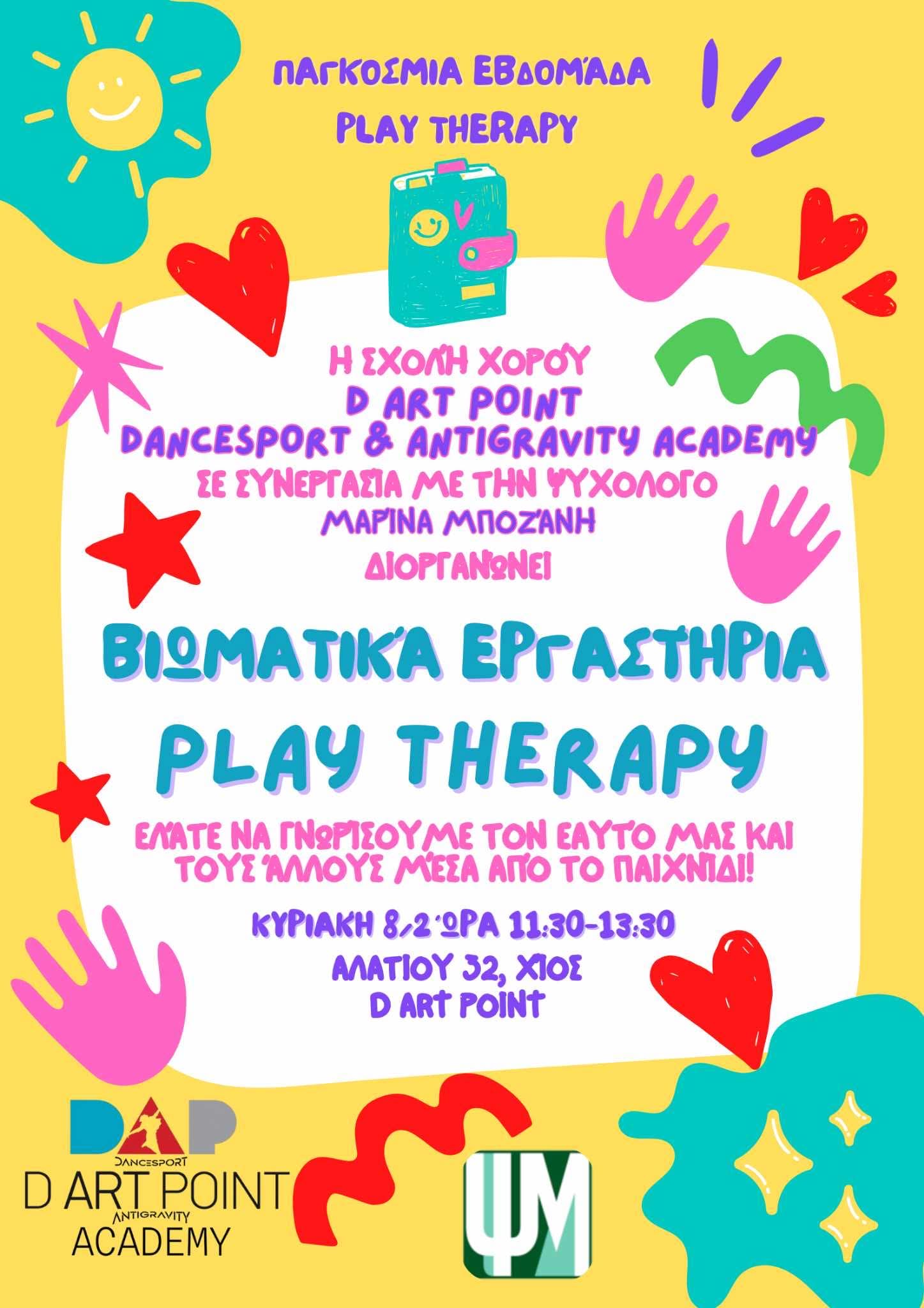 Στις 8/2/2026 με αφορμή την Παγκόσμια Εβδομάδα για το Play Therapy, διοργανώθηκε ένα εργαστήριο Play Therapy για τους μαθητές της Σχολής Χορού D art point Dancesport & Antigravity Academy στη Χίο. Οι μαθητές της σχολής είχαν την ευκαιρία μέσα από βιωματικές δραστηριότητες που βάση τους είχαν το παιχνίδι, να εξερευνήσουν τα συναισθήματά τους και να γνωρίσουν βαθύτερα τον εαυτό τους αλλά και να γνωριστούν μεταξύ τους. Στο αποκορύφωμα αυτής της διαδικασίας, οι μαθητές συνέθεσαν το δικό τους παραμύθι όπως οι ίδιοι το φαντάστηκαν και μέσα από τα δικά τους βιώματα και επιθυμίες.